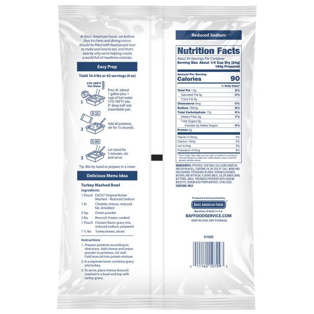 Yield: 125 LB prepared per case. Rich butter flavor mashed potatoes with 50% less sodium than our original. Just add water easiest prep, zero waste and longest holding time. Free of BHA, BHT, Titanium Dioxide & Certified Dyes.