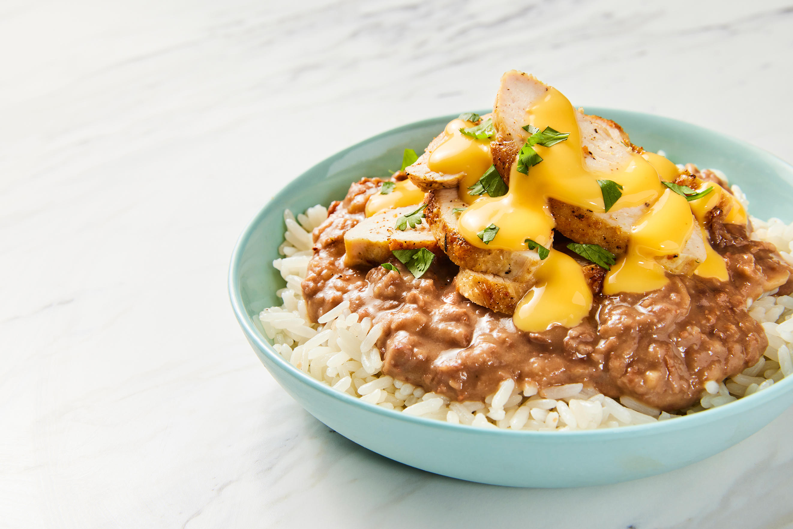 This kid-friendly bowl is the perfect protein-packed lunch with creamy, cheesy refried beans and rice.